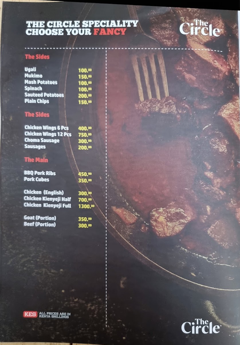 Now, let's talk about the menu—where the real magic happens. The culinary delights at The Circle Chill Spot are simply irresistible. Indulge in the Pork Wet/Dry Fry, where juicy and flavorful pork cubes or tender ribs melt in your mouth, all for KES 600.00 and KES 1,000.00 respectively. For beef enthusiasts, the Anti-Theft dish, marinated in lemon juice and spices, offers a full-bodied flavor experience at KES 900.00. The sides, like perfectly fried sweet plantains (KES 400.00) and crispy chips (KES 265.00), round off the meal with a burst of taste and texture.